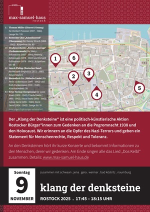 An den Denksteinen in der Altschmiedestr. 26, der Kröpeliner Str. 83 und 98, Lange Str. 7/8 und 15 sowie Neuer Markt 1 finden um 17.45 Uhr kleine Konzerte statt. Um 18.15 Uhr wird dann „Dos Kelbl“ (Jiddisches Lied) gemeinsam gesungen.